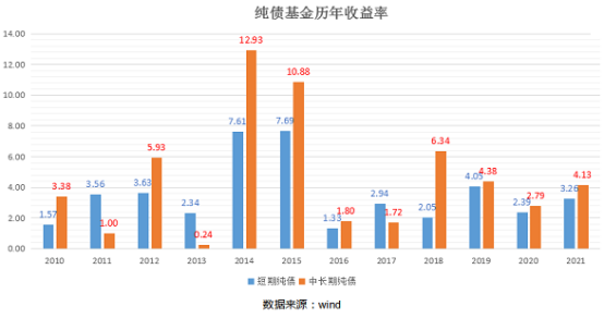 第二个问题,纯债的历史收益率,分为短债、中长债,可以参考下图。短债在1.3%-7.7%,中长债在0-13%。