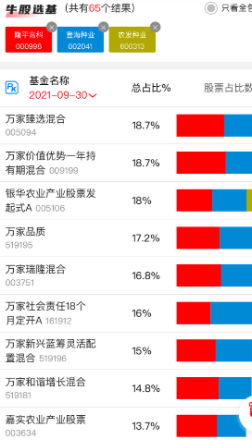 也可以通过市场中的一些牛股选基的工具,比如我们搜同时持有几只种业龙头股的基金,可以搜到比较纯的农业基金银华农业、嘉实农业,另外我们还看到,万家基金配置了不少农业板块尤其种业股,不过其他持仓的行业也比较分散,未来存在风格飘移风险。