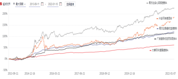 这些不同产品,我们各选1个代表,可以明显看到,纯债、偏债(中低波动)、偏债(中高波动)、可转债,风险逐级提升,而收益整体也是往上走的。但是过度波动,也会损害收益,比如,易方达安心回报债年化收益居然超过了波动大很多的可转债。