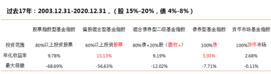 如前面问题,保守、稳健类不想折腾的,是可以选择一些债和固收产品,但是你这个收益率、回撤控制的目标有些“不匹配”。债类产品历史的年化收益率在7%左右,回撤10%以内也不难,但距离你10-15%的年化收益率目标,差距有点大了。历史看,平均回撤高达-35%,年化收益率也只能拿到15%左右,你想最大回撤10%以内就有这个收益,比较脱离实际了。