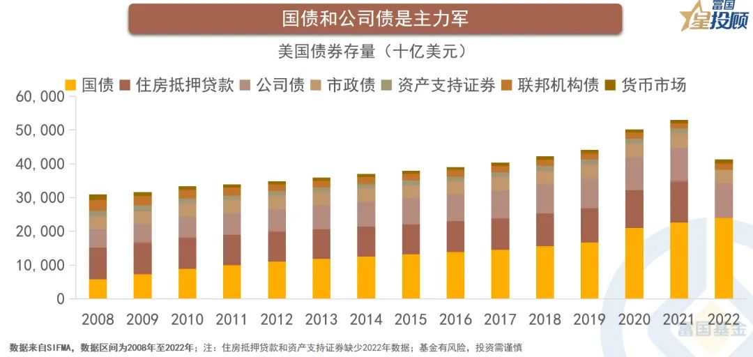 在传统的认知中,美国权益市场非常发达,为美国经济发展提供了大量的资本。有意思的是,美国固收市场同样庞大,2022年末存量规模达51.94万亿美元,接近权益市场64.67万亿美元的规模,占全球固收市场的比重高达40%。