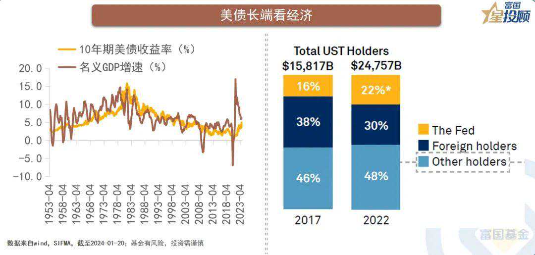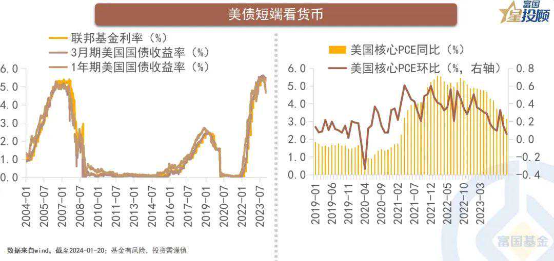 短端美国国债收益率围绕联邦基准利率波动,货币政策起到关键作用。美联储两项政策目标中,通胀高位回落过半,失业率保持稳定,降息年内可期并有望带动短端收益率回落。