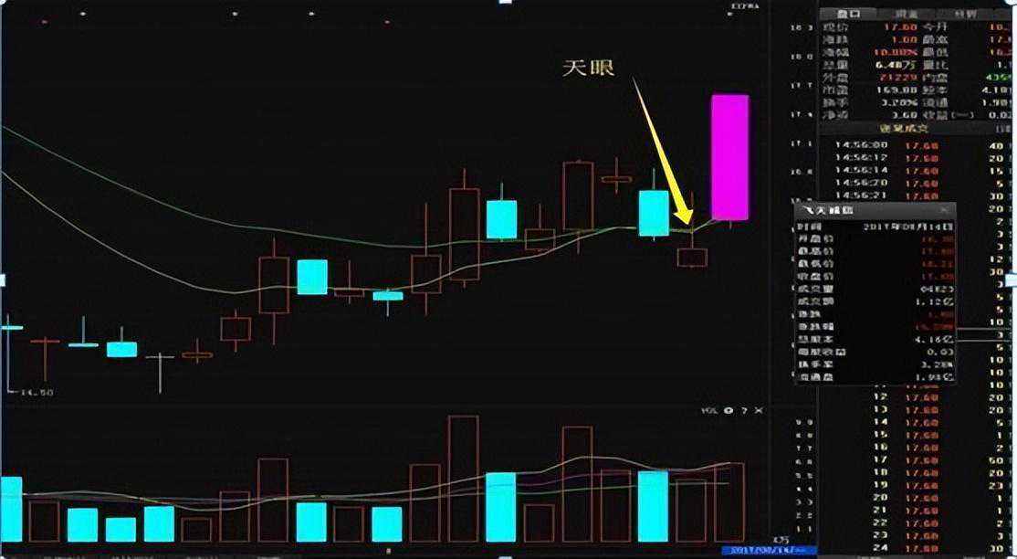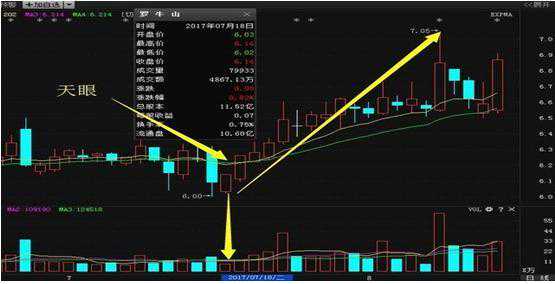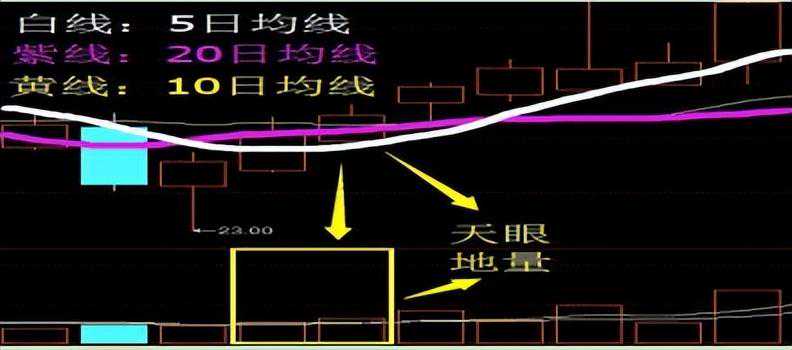 2、5日均线下穿和上穿20日均线两次动作闭合,看起来像眼睛一样,称为天眼。