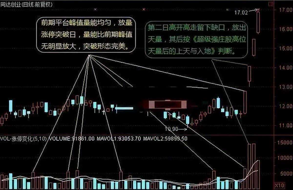 如下图所示,在一直股票的放量突破日,量能无明显放大,这种突破形态是非常完美的,如果涨停的第二天留下缺口,放出天量就会连续涨停。