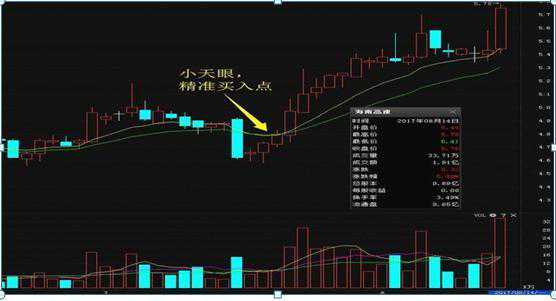 用5日、20日平均线K线图,是因为5日代表一周交易日,20日代表一月交易日,寻找那些5日均线轻微跌破20日均线,形成一个很小的“天眼”,这是一类很典型的图形,在股市中的“天眼”常能捕捉到大黑马。