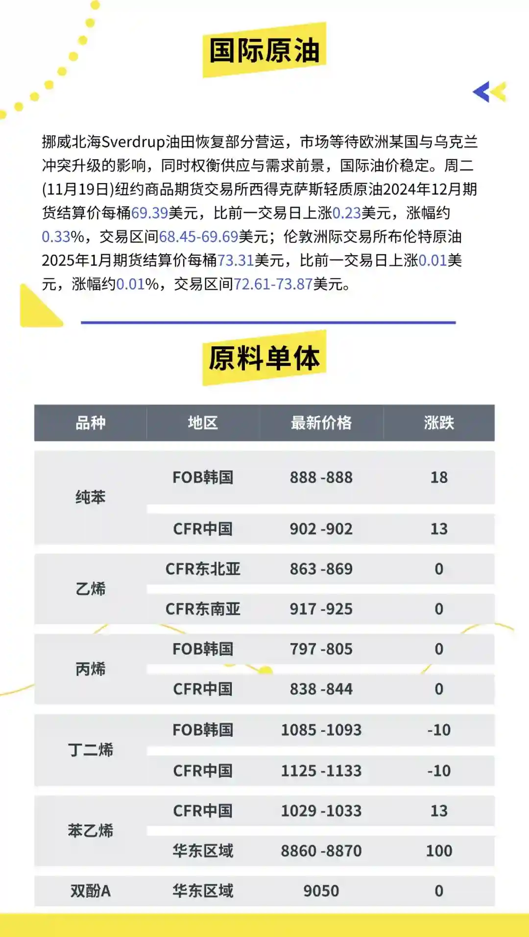 19日,亚洲乙烯市场清淡持稳,上游市场震荡,场内几无实单听闻。石脑油价格7连跌后反弹。东北亚市场有部分需求出现,但由于下游市场提升有限,买盘意向无明显变化。冬季淡季或即将到来,业者多保持观望,部分将重点放在长约谈判上。CFR东北亚报863-869美元/吨,CFR东南亚报917-925美元/吨。