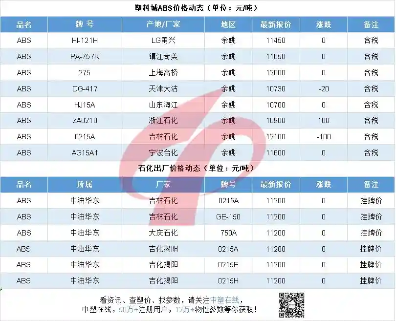 昨日张家港苯乙烯收盘上行,一定程度支撑市场心态,然受ABS高产高库存拖累,市场气氛仍显弱势,余姚塑料城ABS市场行情大体持稳,个别波动。商家谨慎观望操作为主,实盘商谈出货。