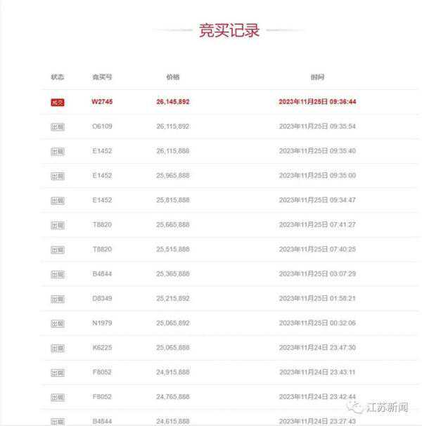 尾号六个“9”,成交价格超两千万元,就连围观拍卖的“吃瓜群众”也已接近5万人次。近日,镇江经济开发区人民法院一个号码为“1xxxx999999”的手机靓号,经过2小时竞价后,拍出了2614.5892万元的“天价”。然而,截至12月3日的最终期限,买家却迟迟没有交付尾款。