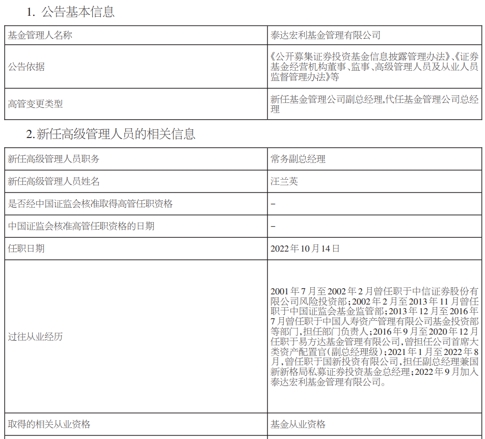 据泰达宏利公告,自2022年10月14日起,汪兰英任泰达宏利常务副总经理、代总经理职位。