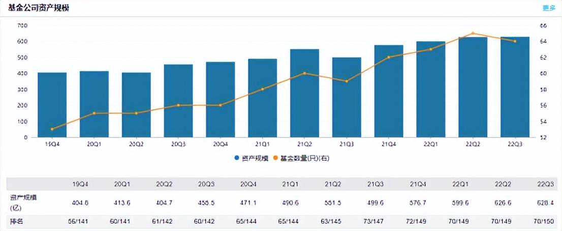 近年来,泰达宏利规模增长疲软,从2019年末的404.8亿元增至2022年三季度末的628.4亿元,近3年仅增加200多亿元,规模亦从56名下降至70名。