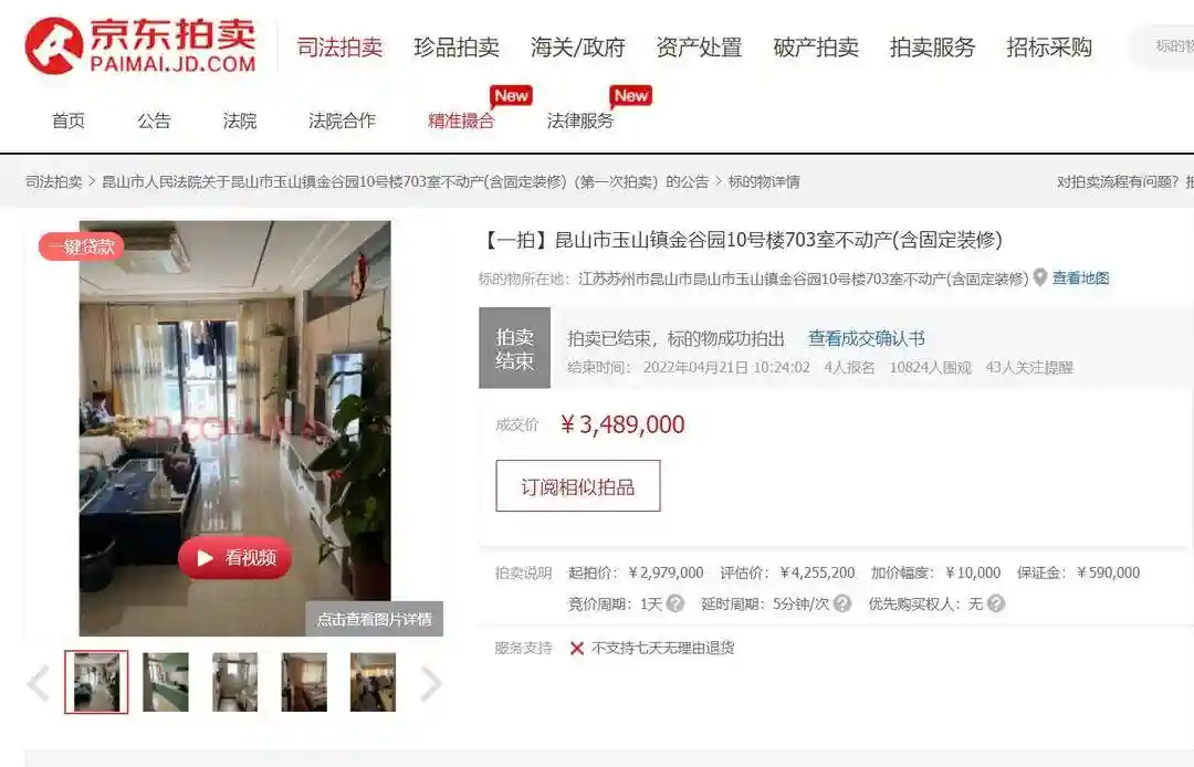 本次法拍节中,京东拍卖联合苏州11家法院为竞买人提供了优质的法拍房标的,3天时间成交8套住宅,成交金额累计超1000万。其中,起拍价297.9万元的昆山市玉山镇金谷园的一套住宅,最终以348.9元成交,成为法拍节中成交金额最高的房产。以186万元起拍的巴城镇通澄南路766号龙城雅居的一套房产,最终以288万元成交,期间经过151次竞价,溢价率54.9%,成为竞拍最激烈的房产。