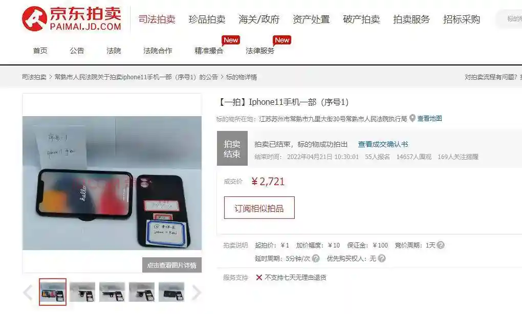 除了机动车、房产等大额标的,不少消费者也通过拍卖购买日常用品。在本次法拍节期间,苹果、华为等品牌的24部手机1元起拍,累计吸引22万人围观,在531人竞拍的下,最终全部成交。其中,一部iPhone11以114次出价,成为竞价次数最多的手机。此外,众多国产品牌白酒也颇受青睐,共有100瓶白酒成交,其中剑南春、五粮液1618、五粮液七代最为抢手。