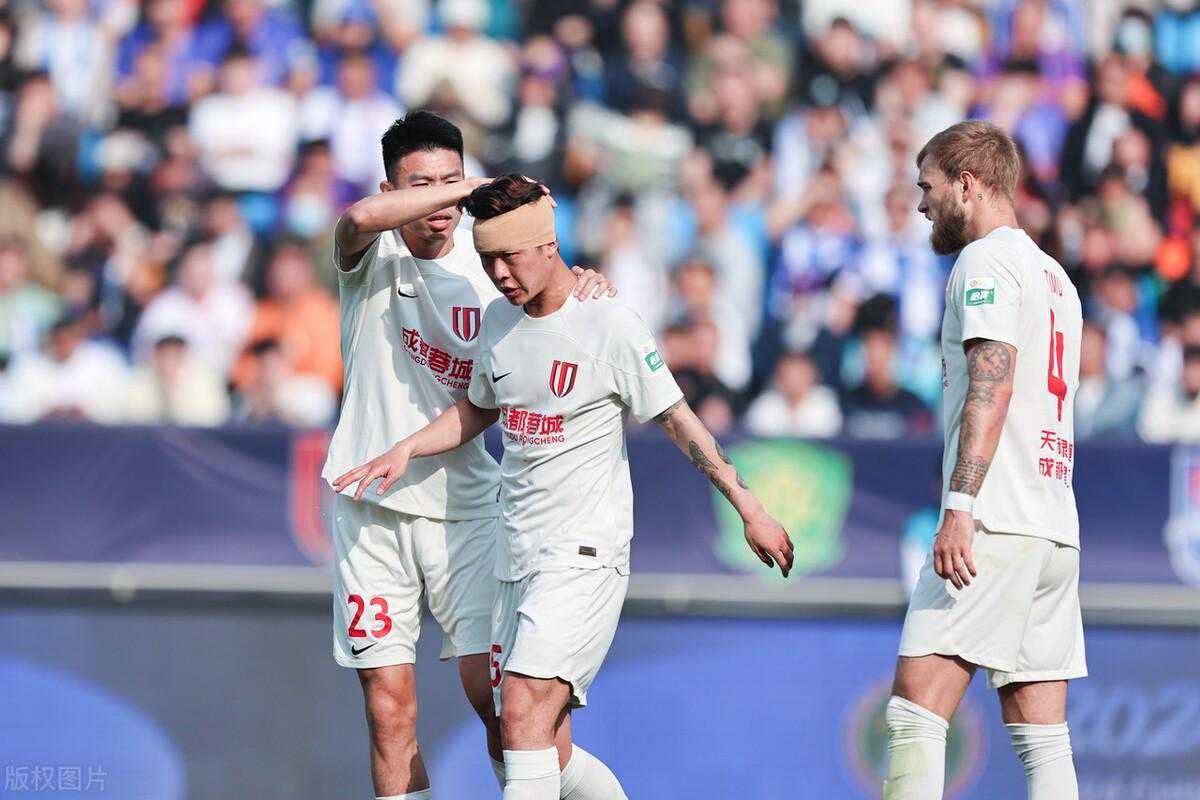 第26分钟,样严鼎皓禁区解围时头部受伤,血流不止,经队医包扎后继续作战。