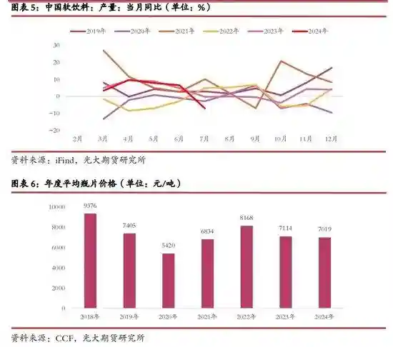 目前国内瓶片下游需求主要为软饮料,今年二季度开始中国软饮料产量当月同比出现了逐月下滑的局面,2024年7月产量同比出现了年内的负增长,国内消费相对疲弱,需求动力不足。