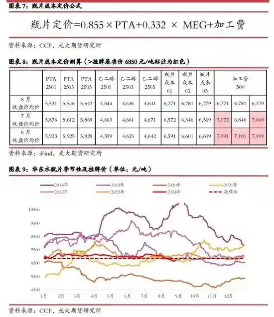 从瓶片现货价格来看,2024年年内波动区间在【6655,7224】元/吨,年内平均价格为7019元/吨。对于瓶片现货来说,在多年发展过程中逐渐形成以成本导向法定价的习惯。按照目前TA2503、TA2505和EG2503、EG2505合约月均价格进行定价PR2503、PR2505。目前TA和EG的主力合约为2501合约,故同样将2501合约共同测算。(加工费按照2024年前8个月瓶片平均加工差500元/吨测算)
