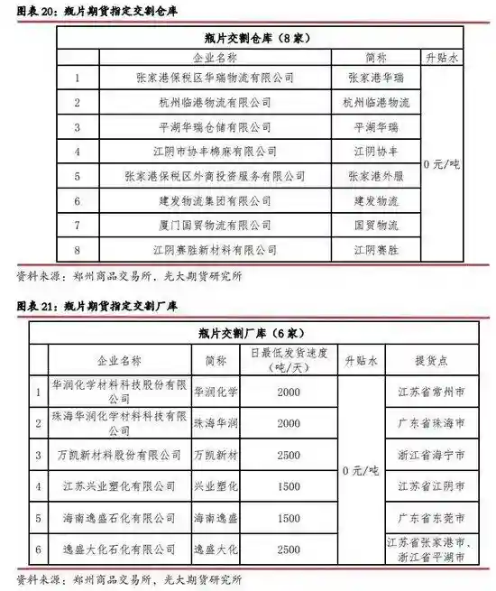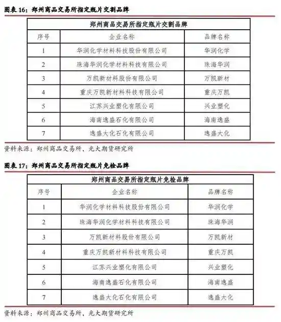 瓶片工厂普遍规模大、信誉好;瓶片标准化程度高,质量稳定性强;复合交割,拓宽仓单注册途径,满足多元化交割需求。