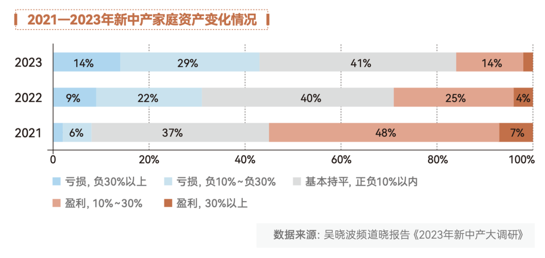 更大比例的新中产家庭,只能把家庭资产维持在相对平衡(-10%n10%)的水平,而且这个比例从2021的37%上升到了2023年的41%。