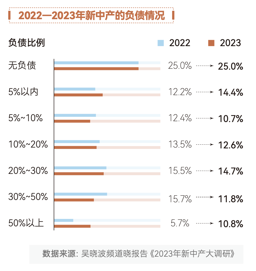 如今,新中产人群内部对债务水平的理解也出现了分化。2023年,他们努力“缩表”,把负债率降到了5%以内的新中产比例达到了39.4%,较2022年提高了2.2个百分点;同时,也有人在“扩表”,家庭负债率50%以上的人群比例,同比提高近一倍。
