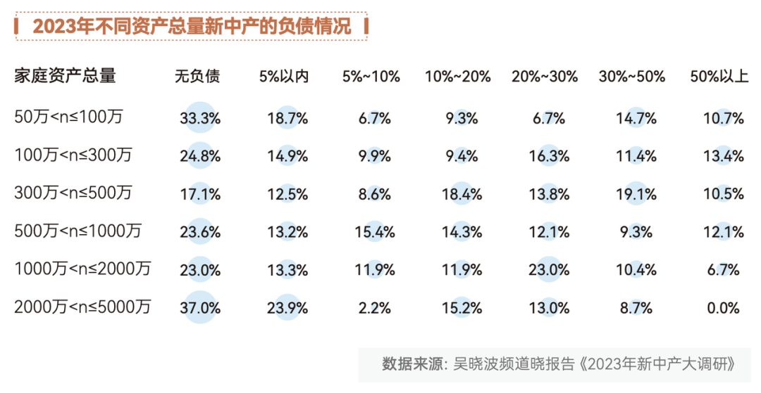 按照家庭资产情况拆分新中产人群,就能发现:2023年,“低负债”成了越来越多新中产的共识。尽管适度负债能够提高资金的利用率,帮助新中产更好地利用资金实现投资增值。但在无法确保投资回报率能够跑赢资金使用成本的前提下,利用手头资金降低负债比例,似乎比投资更靠谱一些。