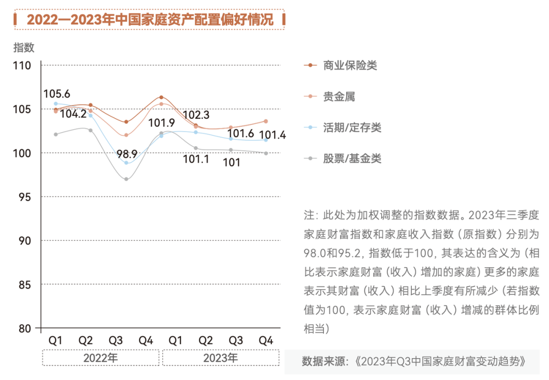 比较明显的是,2023年以来中国家庭对于股票/基金类产品的配置意愿,处于下降区间。同样处于下降区间的投资品还有活期/定存类产品。这说明中国家庭不仅忌惮高风险投资品带来的不确定性,也不希望通胀带来财富贬值——所以,投资态度谨慎的中国家庭,仍然需要给资产找到合适的去处。