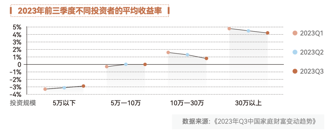 数据显示,当前市场的收益情况,对小投资者并不太友好,因为收益率和投资金额呈显著的正相关关系。2023年前3个季度,理财金额在5万元以内的投资者,平均收益率分别为-3.3%、-3.1%和-2.9%。而投入金额超过30万的人群,平均收益率达到4.8%、4.5%和4.2%。