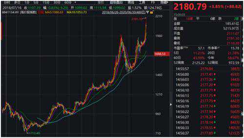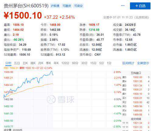 今日茅台持续拉升,上涨逾2.5%股价突破1500元大关,超过零售指导价1499元,6年涨逾40倍,最新市值1.88亿元,依然稳居两市第一。此外五粮液、泸州老窖等多只白酒股创新高。