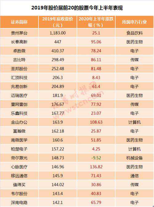 与之相对的是,2019年末股价最低的前20只股票中,仅有*ST中南一只股票今年上半年股价实现上涨,多只股票最终退市或濒临退市。