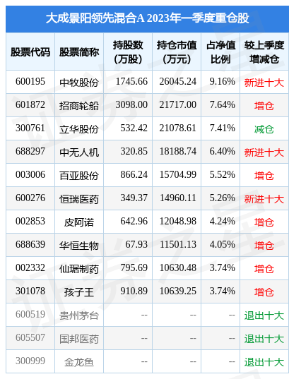 大成景阳领先混合A的前十大重仓股如下: