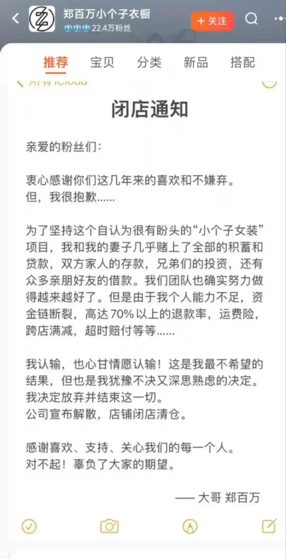 在淘宝经营着一家女装店的郑先生从今年7月份开始,正式打算闭店,10月,他在拥有22.4万粉丝的“郑百万小个子衣橱”店铺主页发布闭店通知。