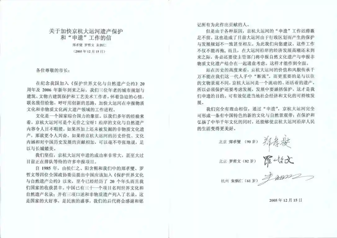 《关于加快京杭大运河遗产保护和“申遗”工作的信》(2005.12.15)
