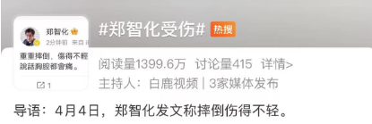 据郑智化在微博上宣布,由于一次重重的摔倒,他受伤严重,导致新专辑录制不得不延后。
