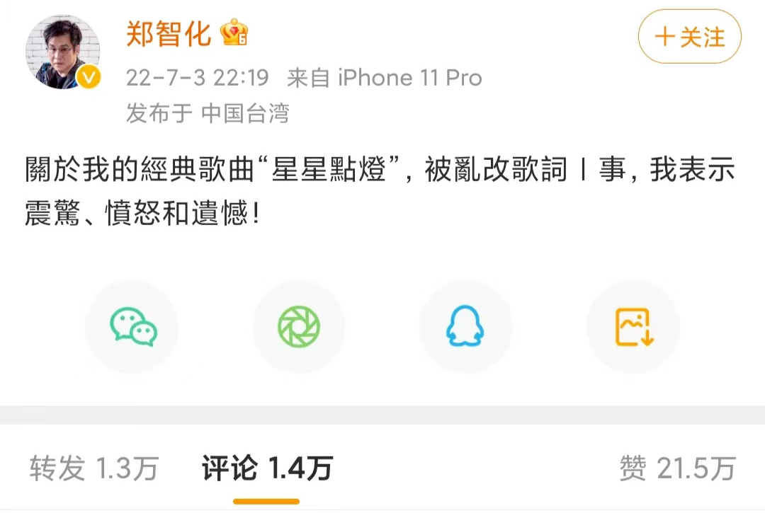 近期,郑智化在微博上发文表达了他对经典歌曲《星星点灯》被乱改歌词的愤怒和遗憾。他表示震惊,并呼吁大家尊重原创和传统,不要对艺术进行随意篡改。
