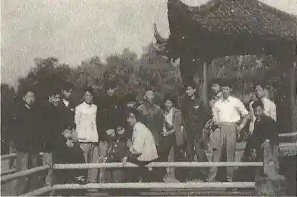 刘江(左一)全班同学与潘天寿校长(左六)黄羲、方增先、高培明等老师在西湖(1959年)