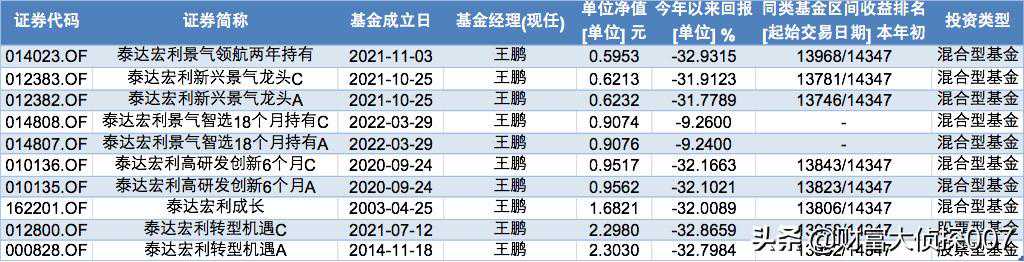 而泰达宏利管理的权益类基金中,最惨的当属王鹏管理的泰达宏利景气领航两年持有,自2021年11月3日成立到2022年4月22日,半年时间大幅下跌32.93%,单位净值也一路跌到了0.5953元!
