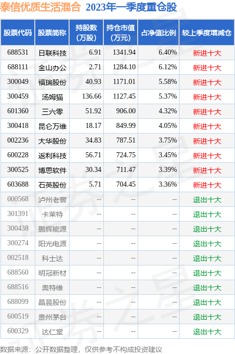 根据2023Q1季报公募基金重仓股数据,重仓该股的公募基金共28家,其中持有数量最多的公募基金为泰信优质生活混合。泰信优质生活混合目前规模为2.1亿元,最新净值0.7538(6月30日),较上一交易日上涨0.39%,近一年下跌18.3%。该公募基金现任基金经理为吴秉韬。吴秉韬在任的基金产品包括:泰信国策驱动灵活配置混合,管理时间为2019年7月25日至今,期间收益率为187.86%;泰信低碳经济混合发起式A,管理时间为2021年11月3日至今,期间收益率为-32.16%;泰信优势领航混合,管理时间为2022年9月7日至今,期间收益率为-0.57%。