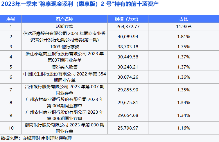 在产品前十大资产中,票息率较高的是第十大持仓“23徽商银行CD030”,该存单剩余期限为0.5616年,当期票面利率为2.71%,发行人为徽商银行股份有限公司,主体评级为AAA。