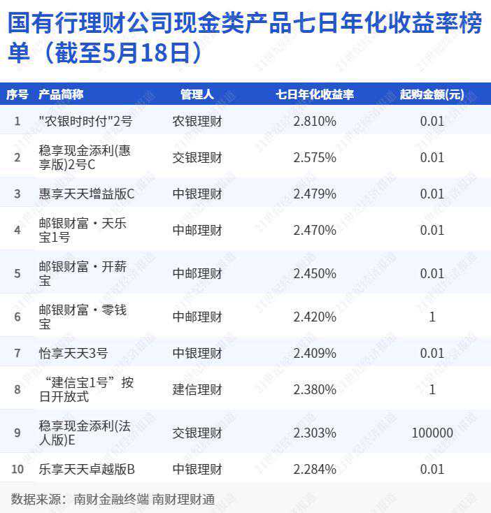 南财理财通数据显示,截至5月18日,在国有行理财公司现金类产品七日年化收益率榜单中,中银理财和中邮理财各有3只产品上榜;交银理财有2只产品上榜;农银理财和建信理财各有1只上榜。