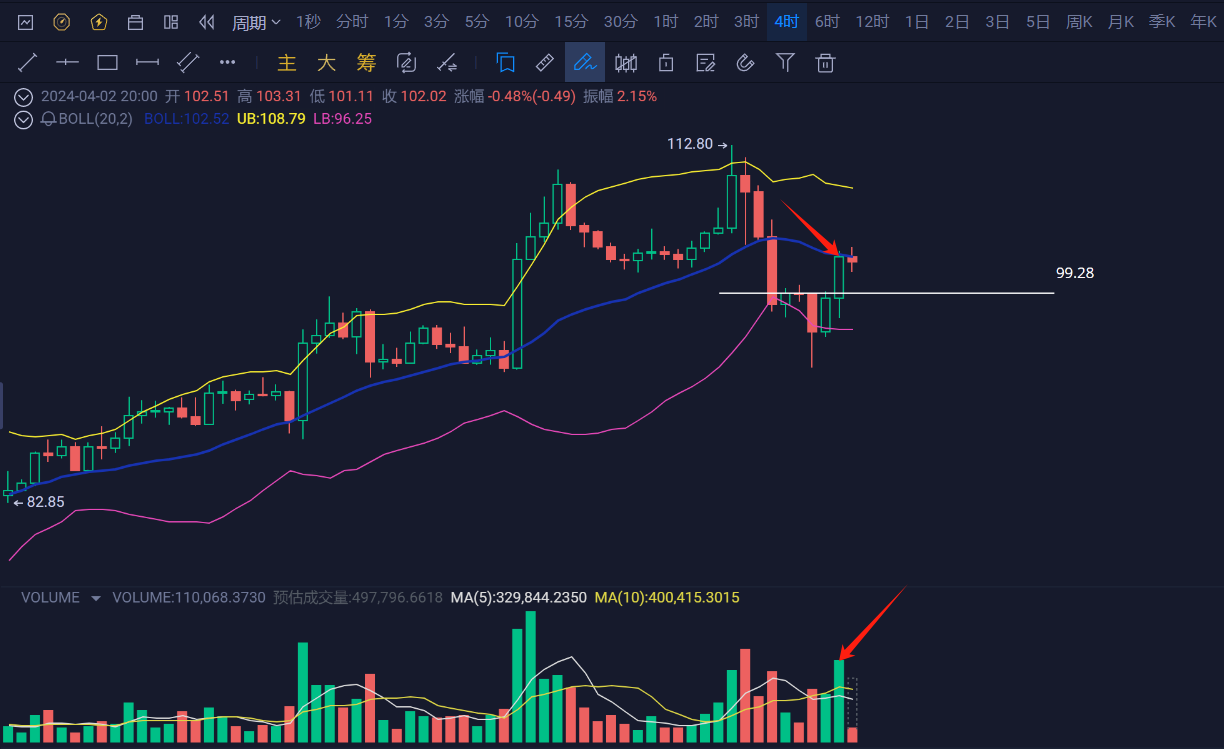 LTC在一波下跌之后,在支撑位附近出现了一个放量的刺透,行情止跌,上一个四小时K线再次出现了一根中长阳线,量能继续放大,这说明多头比较强势。