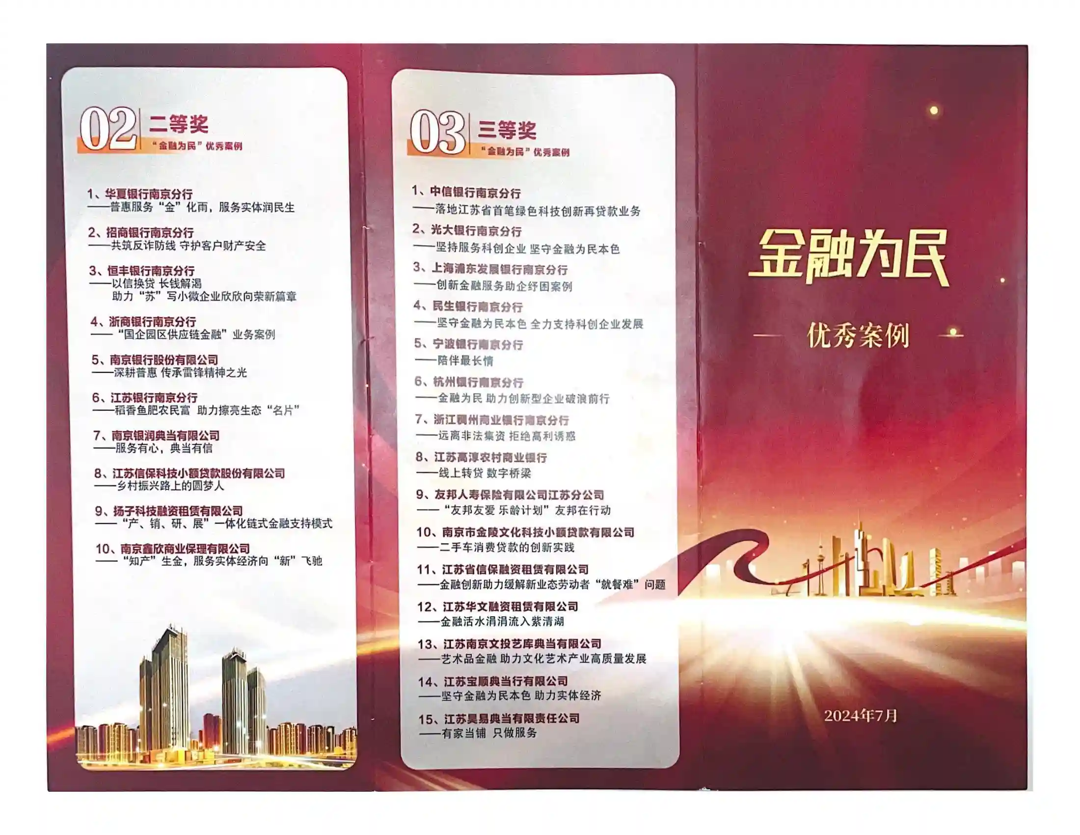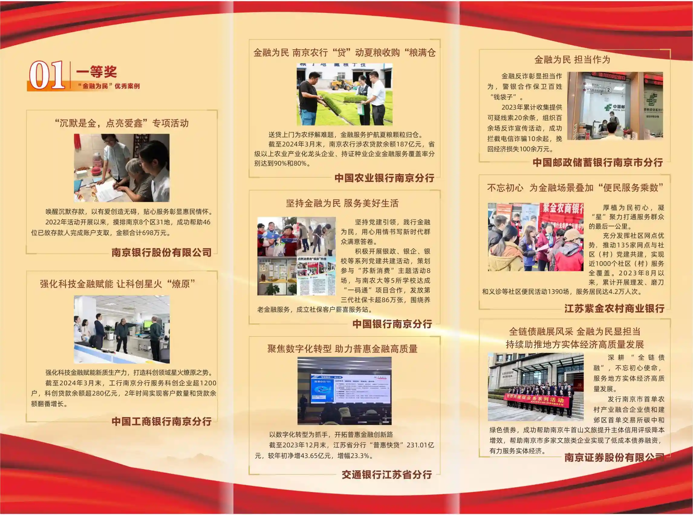 现代快报记者了解到,今年5月,南京市委金融工委以“坚守金融为民本色”为主题,开展优秀案例征集活动。经过多轮评审,评选出一等奖8名、二等奖10名、三等奖15名。其中,南京银行股份有限公司的“‘沉默是金,点亮爱鑫’专项活动”、中国工商银行南京分行的“强化科技金融赋能让科创星火‘燎原’”等8个案例荣获一等奖。华夏银行南京分行的“普惠服务‘金’化雨,服务实体润民生”、招商银行南京分行的“共筑反诈防线守护客户财产安全”等10个案例荣获二等奖。中信银行南京分行的“落地江苏省首笔绿色科技创新再贷款业务”、光大银行南京分行的“坚持服务科创企业坚守金融为民本色”等15个案例荣获三等奖。