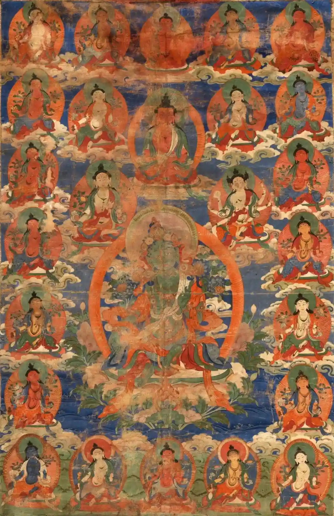 二十一度母,藏语称“卓玛聂久”,绿度母是二十一度母之首,被认为是观音菩萨化身,是度脱和拯救苦难众生的一族女神,同时也是藏传佛教诸宗派崇奉的女性本尊群。因此二十一位度母在藏族地区被广大信徒或百姓普遍敬拜,有着极大的吸引力。