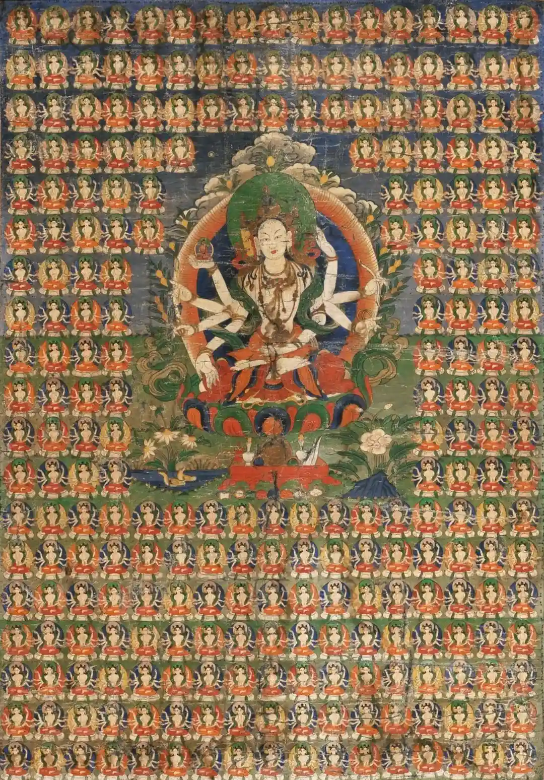 在主尊周围二百多尊佛母形象,尺寸虽小但是每一尊都绘制精细,营造出气势恢弘的艺术效果。全幅尺寸较大,构图讲究,布局整齐,勾勒细致,色彩艳丽,内容丰富且寓意美好。