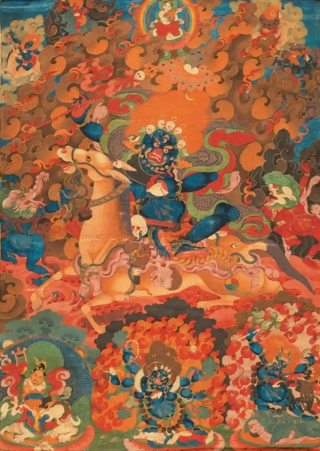 其身着战袍,身材矮胖如大黑天,一面二臂三目,面呈极忿怒相,肤色为蓝黑色,发丝如火焰上燃,头带五头骨冠。右手棒钺杖、手持人心,正坐于骡子上。代表着她的能量和热情,以及她对佛法的坚定守护。整体构图严谨,设色讲究,色层丰富,勾线精细,造型生动,值得珍藏。