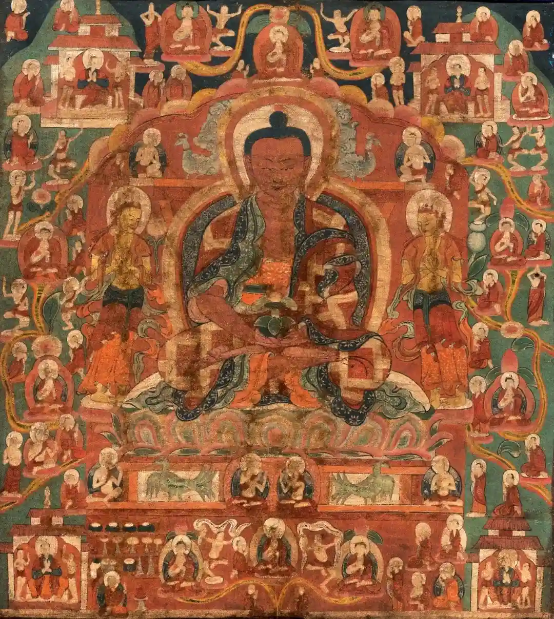 此唐卡主尊为释迦牟尼佛,佛陀身黄色,蓝发高髻,面容端庄秀丽,身着带有装饰的橘色袈裟,慈祥庄严。一手于身前结触地印,一手施触地印,双腿结金刚跏跌坐于五彩莲花月轮之上,座前设珍宝,整体呈现出一种寂静安详的姿态。身后有背光,旁边有青山绿植等作为装饰,色彩对比既强烈又稳重;佛陀前方左右为阿南和迦叶两位大弟子。周围绘制了众多形象,表现出释迦牟尼佛不同时期的场景,表情神态各有差异,衣纹各有不同,将每位人物特质都表达了出来。