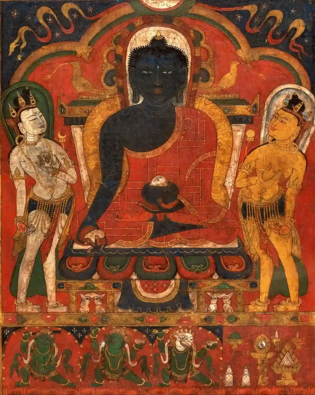 主尊药师佛,身体比例协调,敦厚大方。身着袈裟,饰以田字格纹,上修饰吉祥图案。左手作禅定印,托药钵;右手持柯子结施与印;双跏趺坐于莲台,莲瓣为彩色莲座,莲瓣著有精致描绘。座下之造型及背光之饰,更增添气势。主尊两侧的胁待菩萨,左为月光菩萨,右边为日光菩萨。两位菩萨暗示着药师佛,不分昼夜为众生解除病痛之苦。绘画风格为十二、十三世纪,整体特别是两位胁待菩萨的特点,带有早期波罗(即帕拉)及尼泊尔的艺术风格。