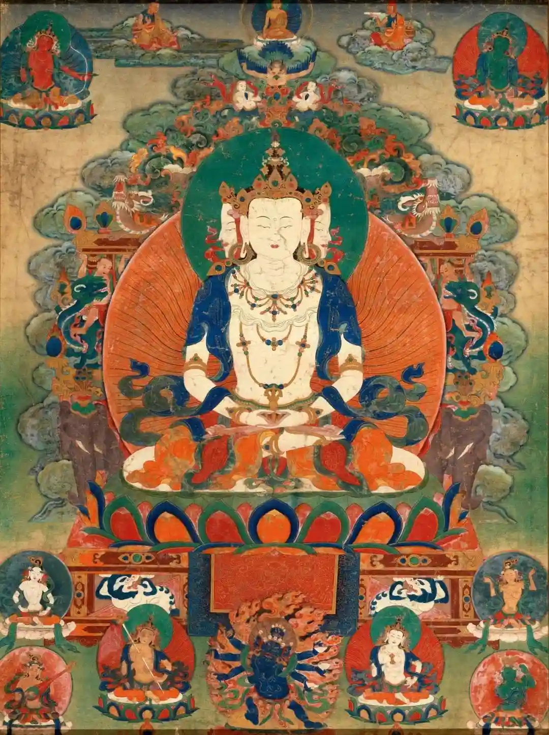 主尊身体与阿弥陀佛一样呈褚红色,头戴金色宝冠,身着菩萨璎珞彩带装,双手结禅定印,托金瓶,双足结跏趺坐与莲座之上,头光背光兼具,庄严神圣。通常西藏都是作为本尊修持。主尊造型丰满圆润,形象稳健;整体构图大气辉煌,画工细致,纹样繁密华丽,细节之处描金,唐卡颜料与配色上也非常讲究,颜色鲜艳、自然而饱和。