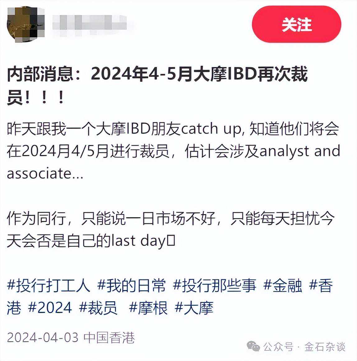 在此背景下,某书童鞋再曝料:昨天跟我一个大摩IBD朋友catchup,知道他们将会在2024月4/5月进行裁员,估计会涉及analystandassociate…base主要是香港。