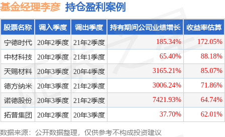 李彦管理的华夏兴和混合A基金在20年2季度买入宁德时代,在持有1年又0个季度后在21年2季度卖出。持有期间的估算收益率为172.05%,持有期间宁德时代在2020年到2021年的年报归属净利润增幅达185.34%。
