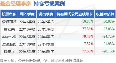 李彦管理的华夏兴和混合A基金在22年1季度买入蒙娜丽莎,在持有1个季度后在22年2季度卖出。持有期间的估算收益率为-30.07%,持有期间蒙娜丽莎在2021年到2022年的年报营业总收入降幅为10.85%。