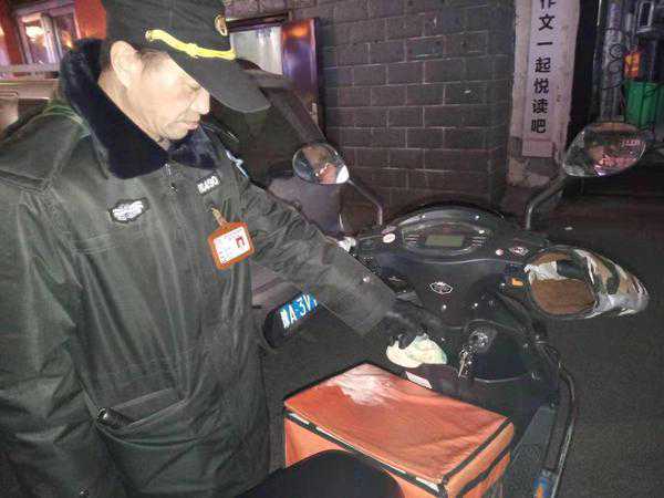 5日凌晨1时35分,郑州巡防队员刘玉忠、李愁等巡逻到农科路小学附近一小区门口时,发现一辆电动车钥匙没拔,车上还放着外卖箱。为防止电动车丢失,队员们决定在此等候车主。十几分钟后,一名男子手里提着几盒饭菜和烧鸡从小区出来。看到这一幕,男子一脸疑惑,巡防员说明情况后,男子十分感动。为了表示感谢,外卖小伙要把烧鸡送给队员,被婉言谢绝。