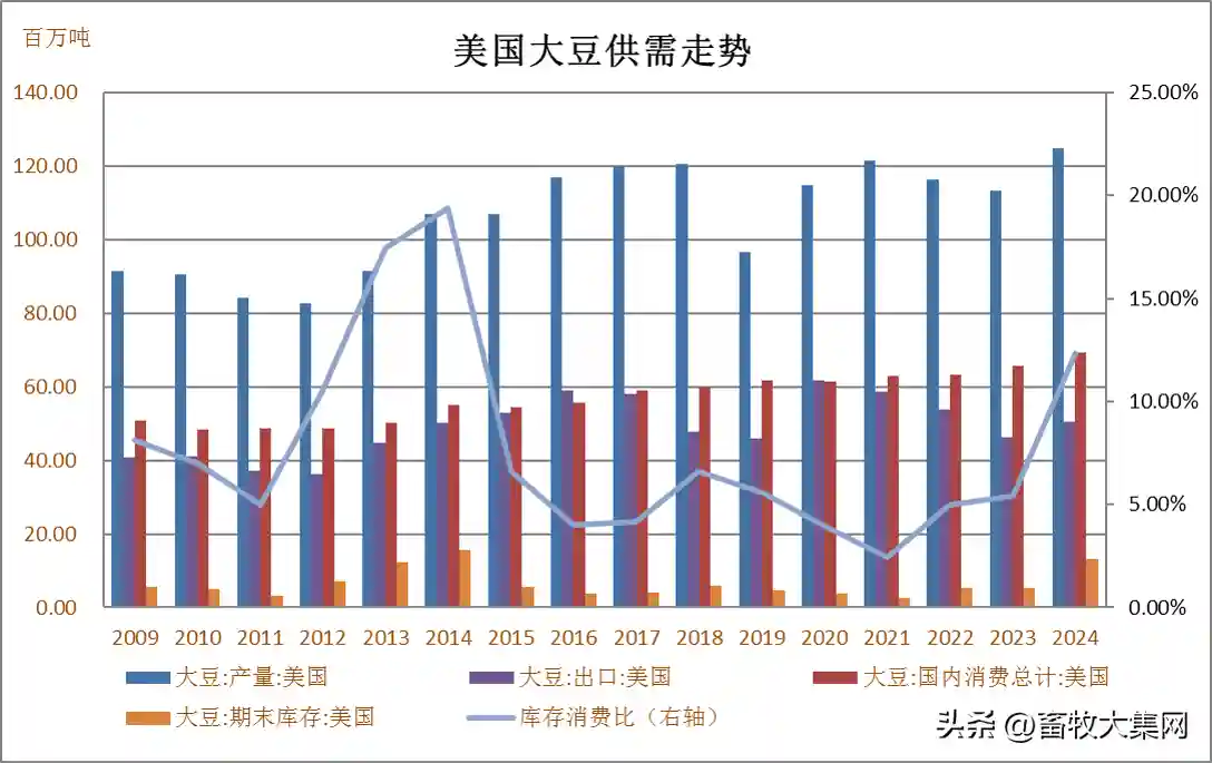 目前全球大豆库存近年最高,市场已经是共识。问题是会不会更高。年度间来看,可能不会更高,这基本决定了市场的运转是低部位区间运行,耐心等待供应的收敛库存的回落。需求好的年景只要库存一回落甚至有回落预期,市场就开始筑底回升了,但需求不好的年景,市场的筑底反弹可能会延迟变长。今年的大豆市场需求锚点在于油而非粕,国内高蛋白日粮等的推广一定程度压缩豆粕的需求空间,尽管近年替代已经高位后续空间有限,但确实也没有找到新的需求增长点,尤其特朗普回归后传统能源低位可能会再度增加,这样生物柴油这个原来可以炒作大豆需求的点也被卡住,大豆需求的增长预期总体来讲是不足的。